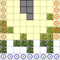 A Tank Trap and Ammo Crate were placed adjacent to each other and the solo Forest Tile on the right side of the map. The other Ammo Crate was placed next to the longest part of the structure. The other Tank Trap remained in it's previous position next to the forest on the left hand side of the table. The Axis chose to hide Angela with a unit of Sniper Grenadiers in the solo Forest Tile next to the Tank Trap and Ammo Crate, Recon Grenadiers on the right hand side in the top most Forest Tile of the group, another unit of Recon Grenadiers in the top most Forest Tile oft he middle group, and Markus with the Axis Gorillas on the left hand side of the map in the Forest Tile next to the Tank Trap that remained in it's location.